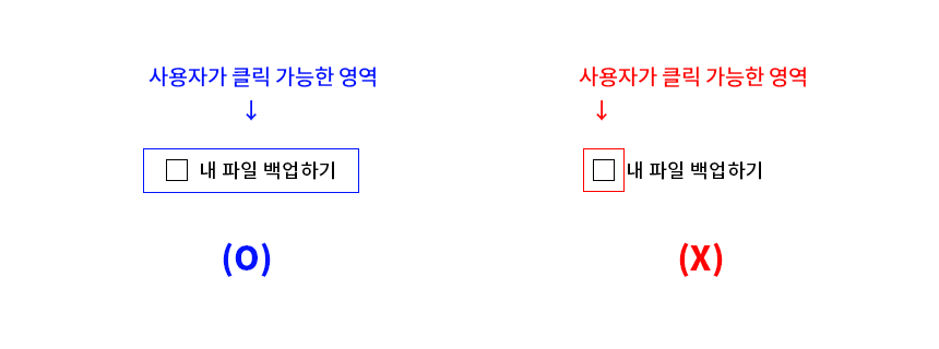 또 한가지 유의해야할 점은, 사용자가 대화형 요소의 아무 곳이나 클릭해도 할당 된 작업을 수행 할 수 있도록 하는 것이다. 예를 들어 링크는 텍스트, 이미지 또는 버튼 형식에 관계없이 전체 영역이 클릭 가능해야한다.