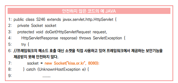 다음 예제는 J2EE 응용 프로그램에서 프레임워크 메소드 호출 대신에 소켓을 직접 사용하고 있어,